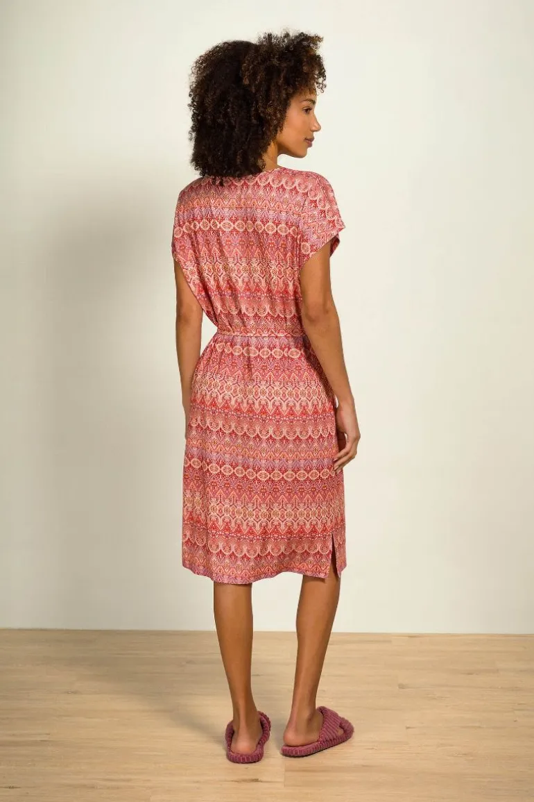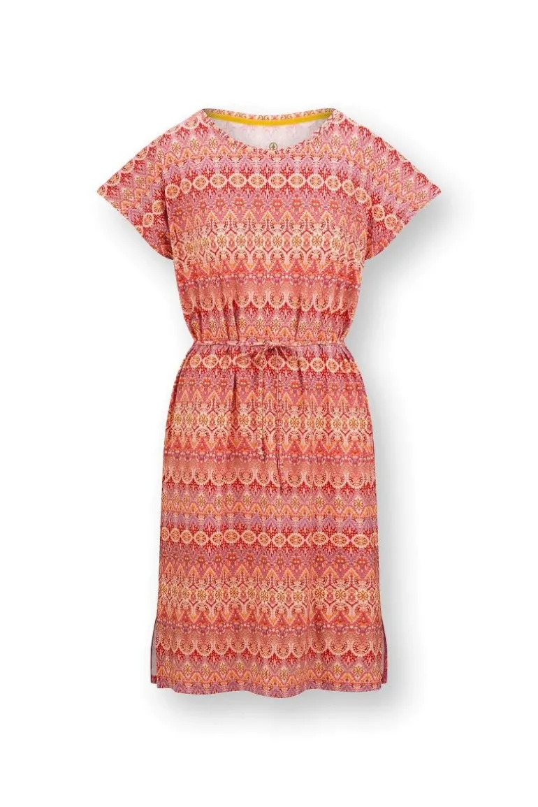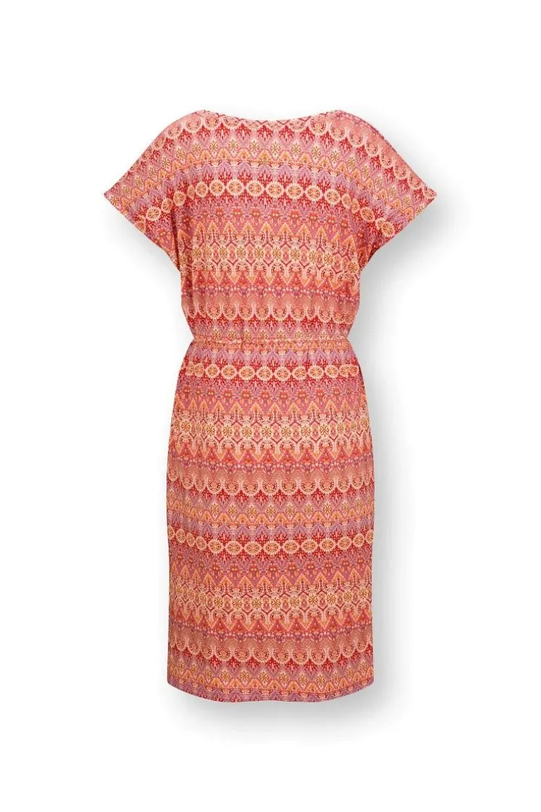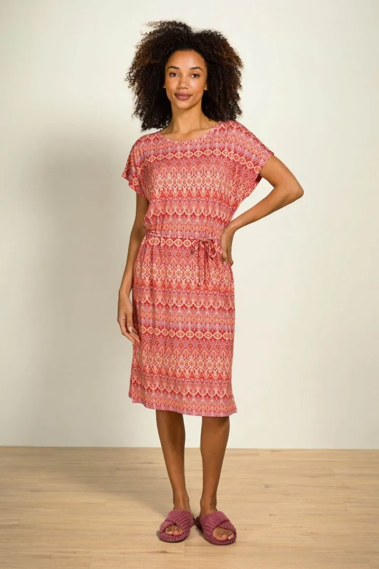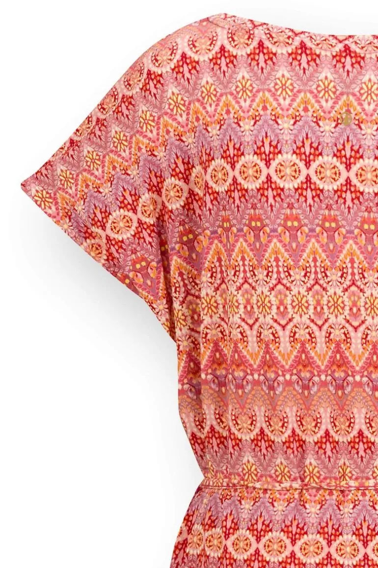 Das Didi Tunika ist ein oversized Oberteil mit einem runden Ausschnitt und abgesenkten Schulternähten, was für ein entspanntes Gefühl sorgt. Es handelt sich um ein gerades Modell, das mit einer Kordel in der Taille figurbetont angepasst werden kann. Die Länge endet knapp über dem Knie. Das Ashanti Muster zeigt horizontale Zickzackstreifen, die aus Blumen, Schmetterlingen und Blättern bestehen. Die farbigen Streifen gehen sanft ineinander über.