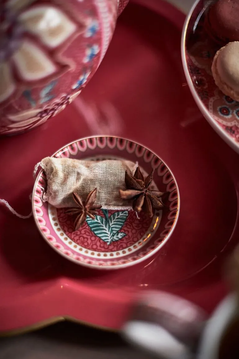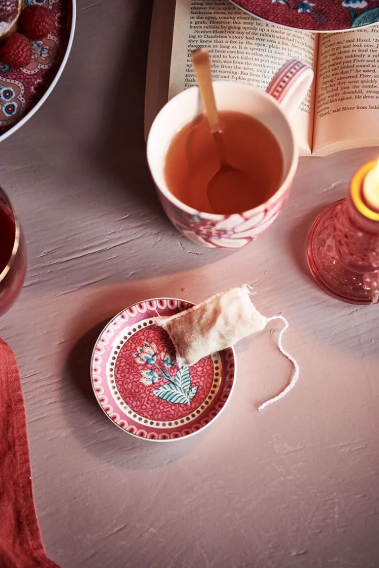 Verschönern Sie Ihren Tisch mit diese eierbecher aus der Flower Festival Kollektion. Die teebeutelablage hat ein florales Design mit phantasievollen roten und rosa Chintzblüten mit hellblauen und grünen Blättern und ist mit einem Muschel-Design abgerundet.