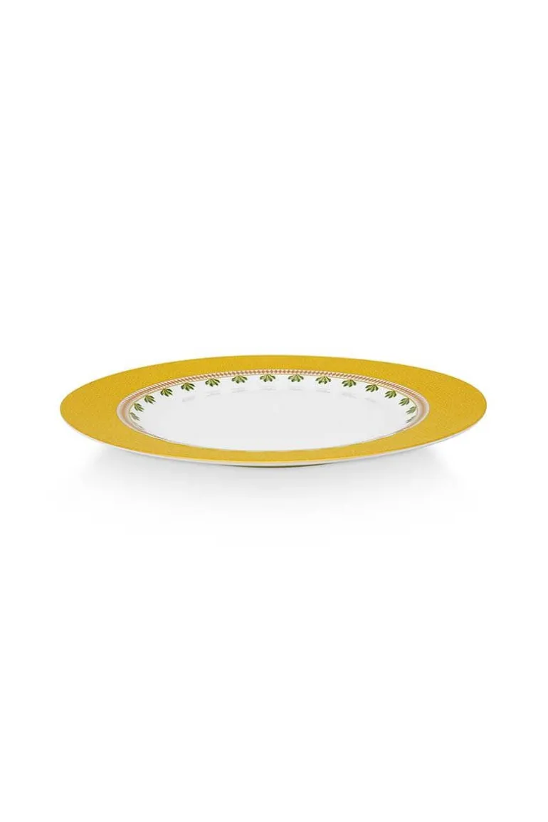 Dieser Essteller ist mit einem Gelb Dessin, exotischen Blumen und goldenen Details verziert. Lässt sich hervorragend mit dem übrigen Geschirr aus der La Majorelle Kollektion kombinieren.