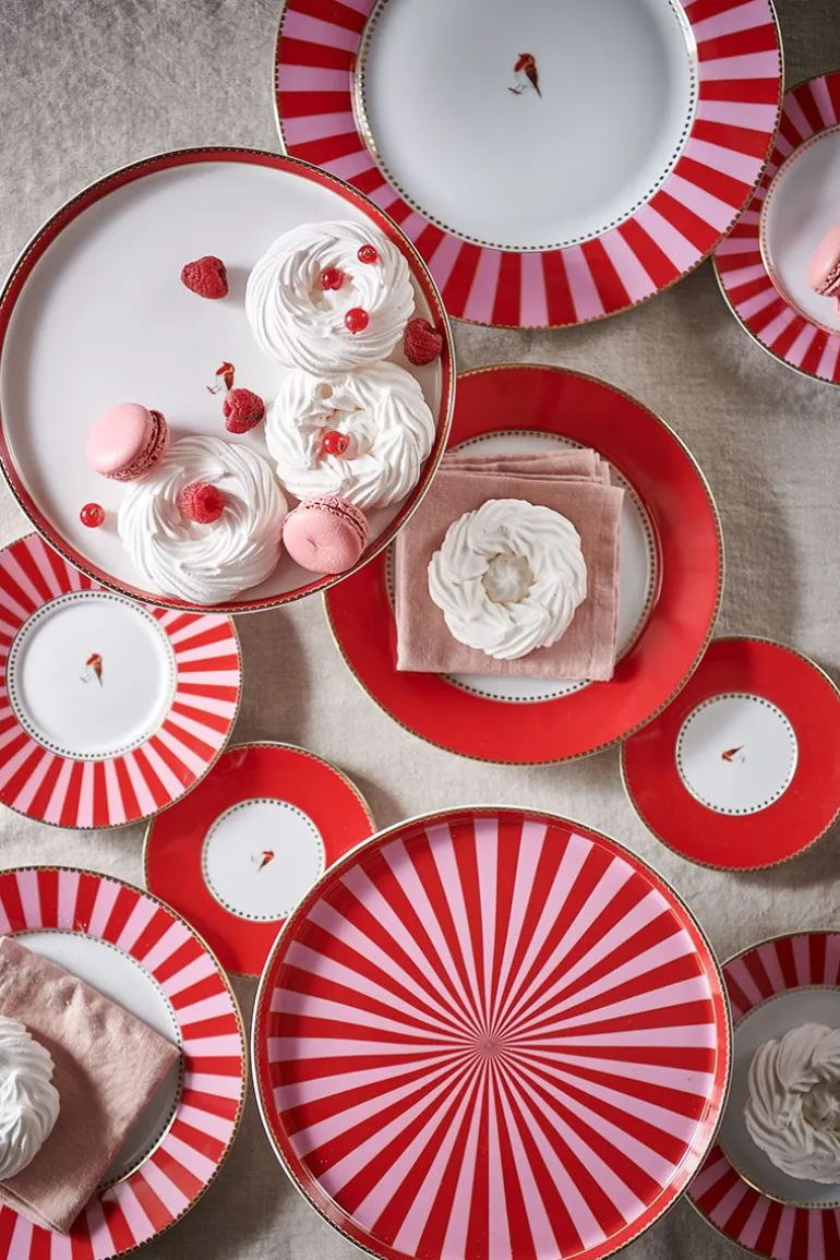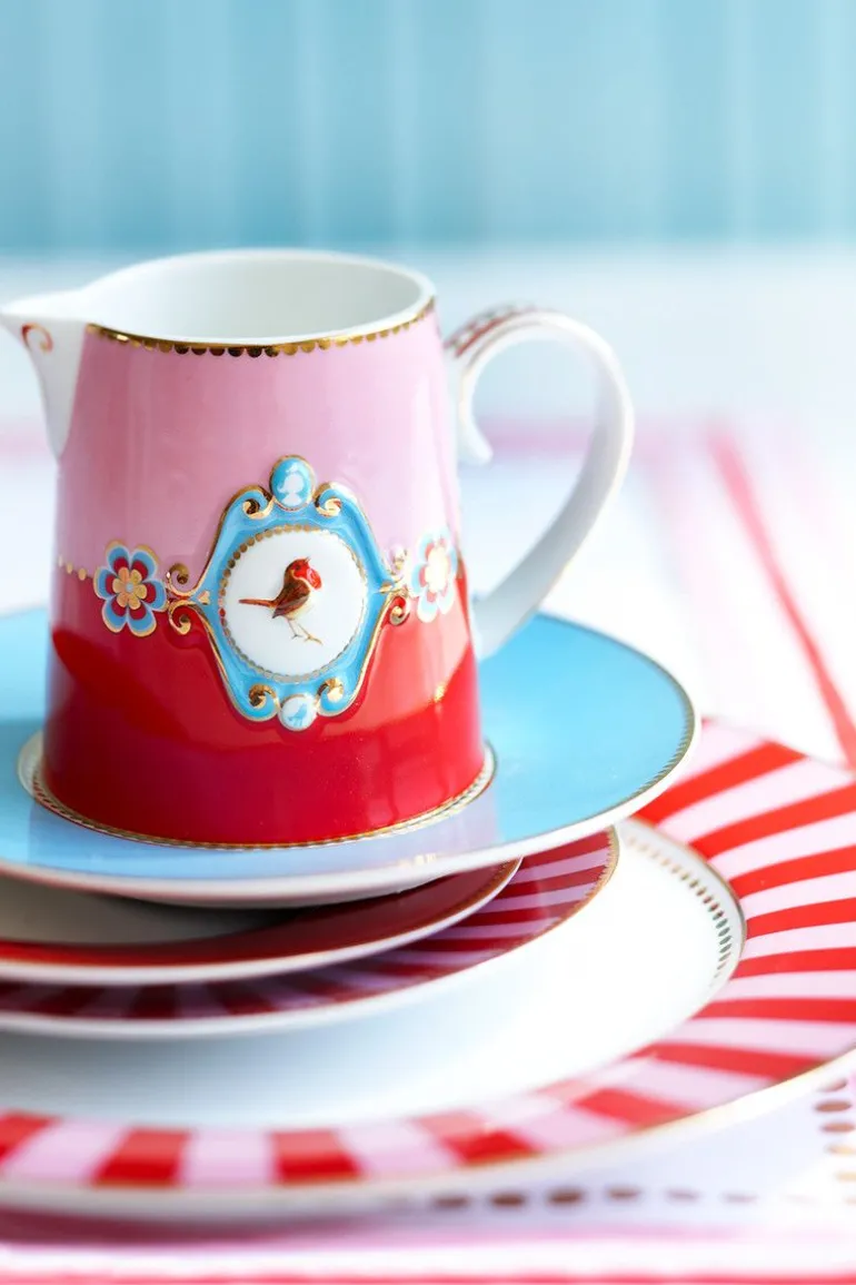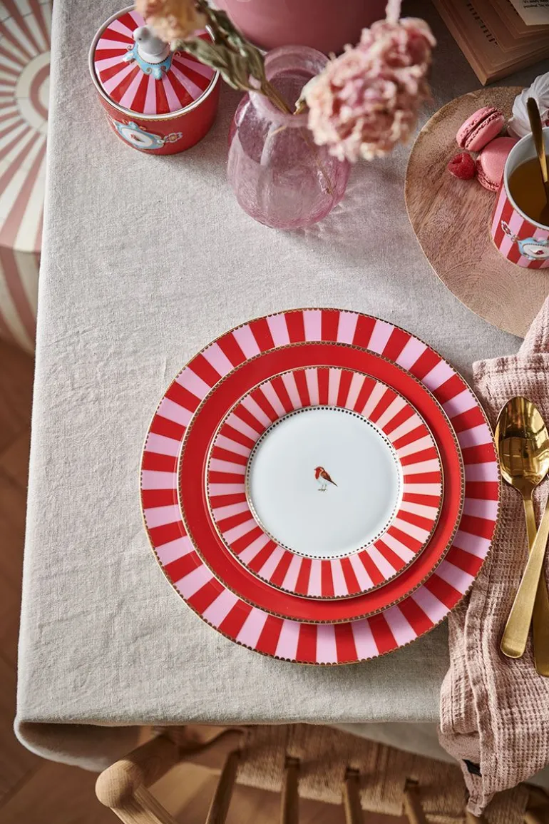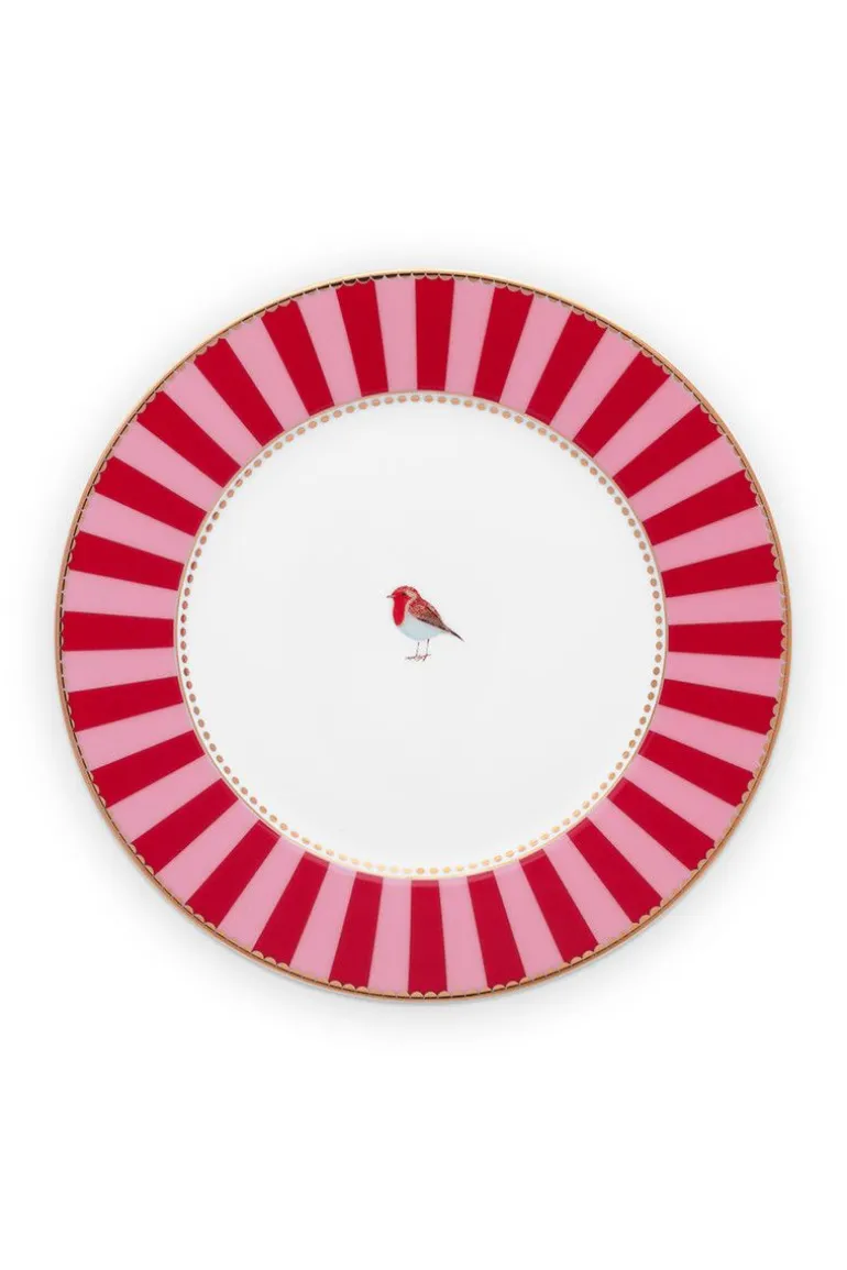 Ein Gebäckteller mit Pips Lieblingsdesign, Love Birds. Verziert mit einem rot-rosa Rand und goldenen Details. In der Mitte ist der Teller mit ein wunderschönes Rotkehlchen versehen. Lässt sich hervorragend mit dem übrigen Geschirr aus der Love Birds Kollektion kombinieren.