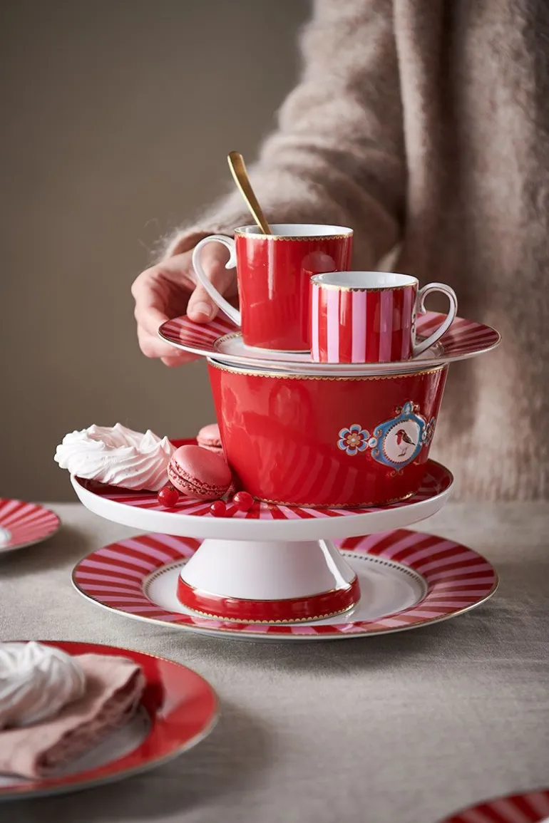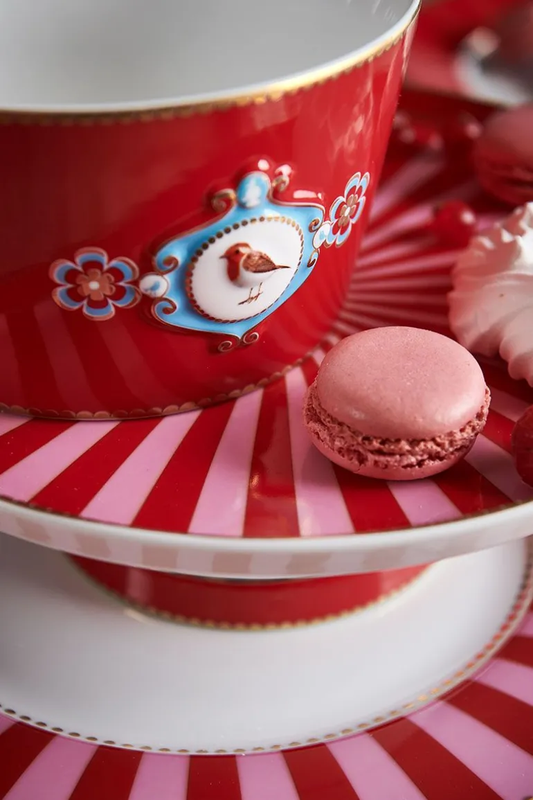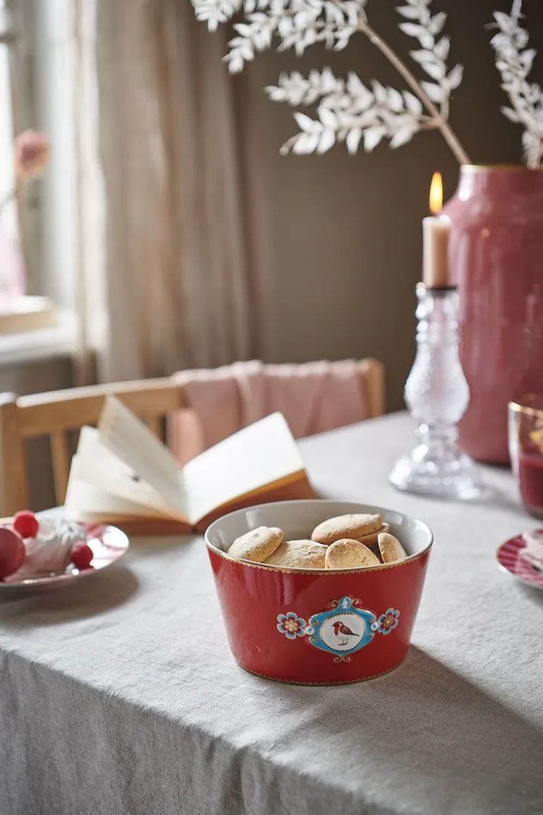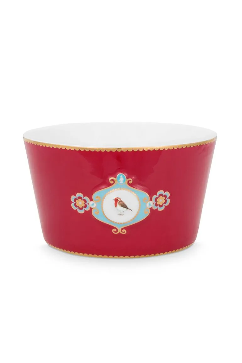 Eine rote Schale mit Pips Lieblingsdesign, Love Birds. Die Schale hat in der Mitte ein Medaillon mit ein wunderschönes Rotkehlchen. Im Inneren der Schale setzen sich Elemente aus dem Dessin fort. Der Rand ist mit Gold versehen. Lässt sich hervorragend mit dem übrigen Geschirr aus der Love Birds Kollektion kombinieren.