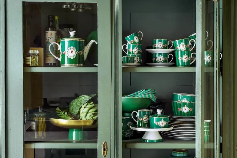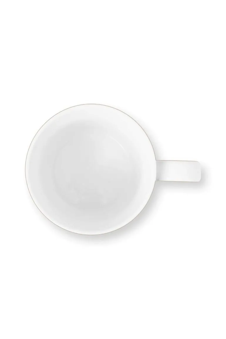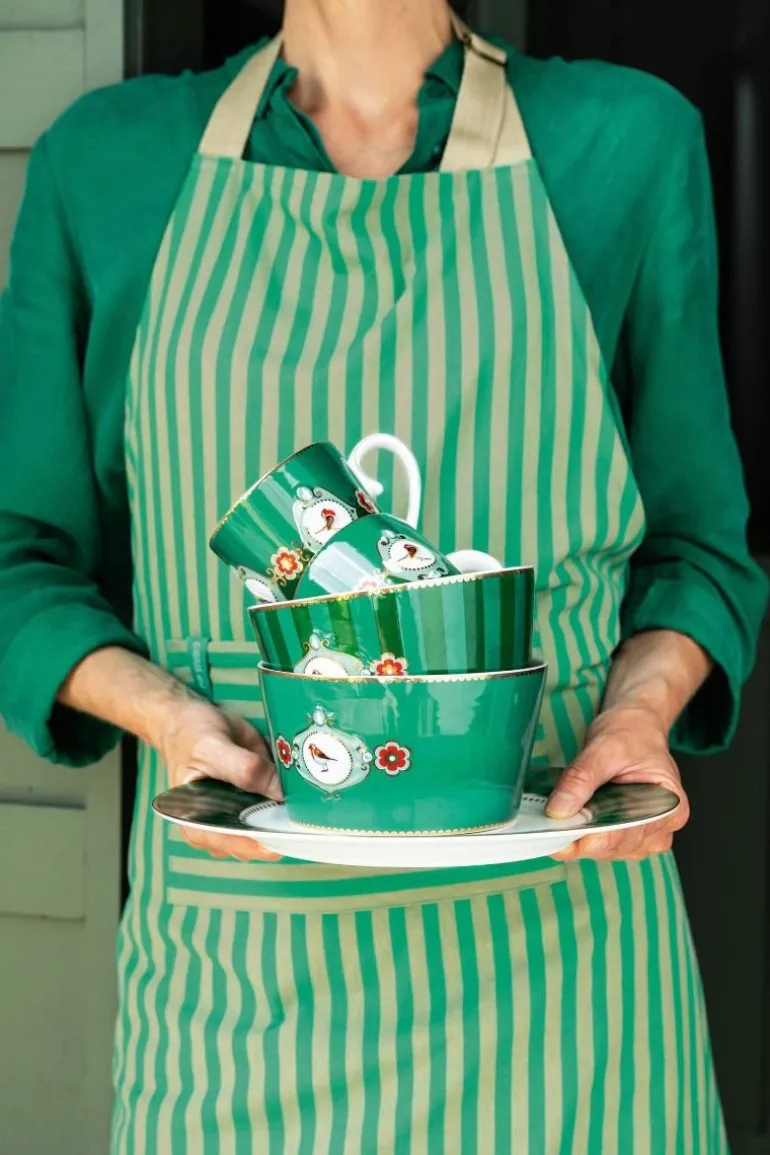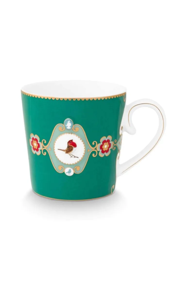 Eine große grünen porzellan Tasse mit Pips Lieblingsdesign, Love Birds. Diese Tasse ist versehen mit ein Medaillon und ein wunderschönes Rotkehlchen in der Mitte. Verziert mit goldene runde Elemente. Jede Tasse ist dekoriert mit luxuriösen Elementen sowie goldenen Details am Griff.