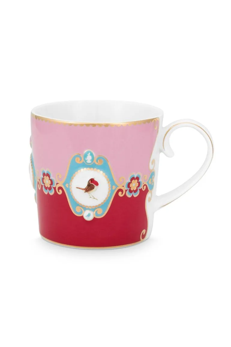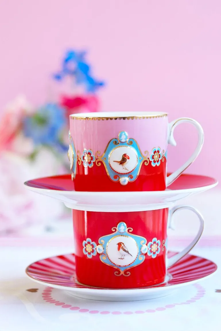 Eine kleine rot-rosa porzellan Tasse mit Pips Lieblingsdesign, Love Birds. Diese Tasse ist versehen mit ein Medaillon und ein wunderschönes Rotkehlchen in der Mitte. Verziert mit goldene runde Elemente und ein Muster von Streifen und Formen. Jede Tasse ist dekoriert mit luxuriösen Elementen sowie goldenen Details am Griff.