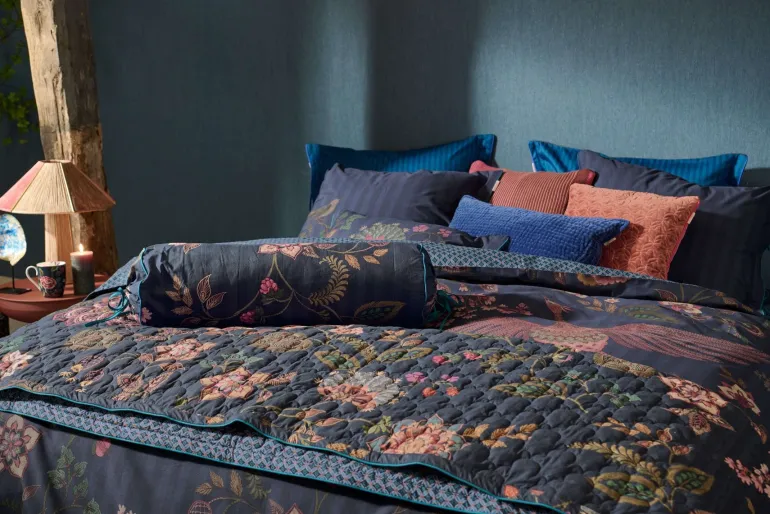 Der Quilt Buenas Noches ist mit reich verzierten Blumen und Blättern gestaltet, die aus nächster Nähe betrachtet eine handgestickte Optik aufweisen. Die Rückseite des Quilts ziert ein stilisierter Fliesenprint.Der Quilt ist mit einem rundum gesteppten, eleganten Muster mit farbiger Paspel ausgeführt, die ihm eine exklusive, luxuriöse Ausstrahlung verleihen. Der Quilt kann beidseitig verwendet werden und ist eine raffinierte Ergänzung zum Buenas Noches Bettbezug. In Kombination mit dem Buenas Noches Dekokissen gelingt Ihnen der ultimative Mix-und-Match-Effekt.