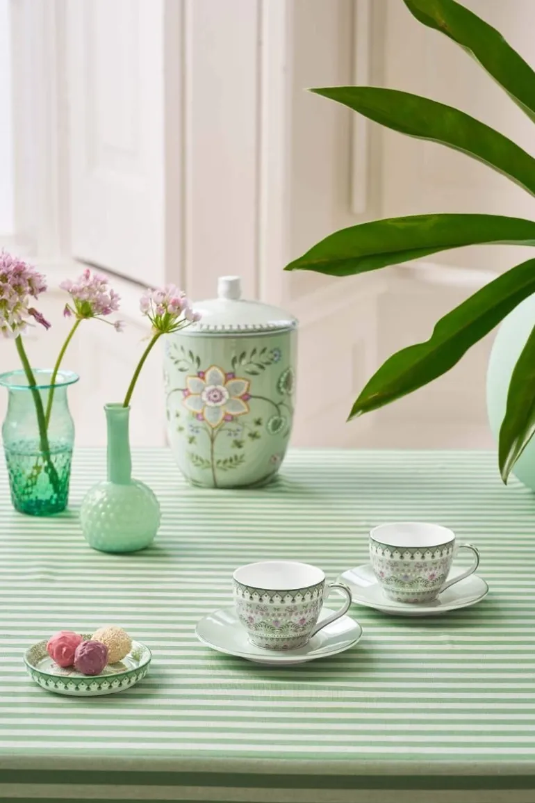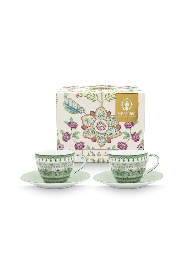 Dieses Set aus 2 Espresso-Tassen mit Untertassen ist Teil unserer Lily & Lotus-Kollektion. Die hellgrünen Tassen sind mit Lotusblättern und Pusteblumen in Pastelltönen verziert. Die Blumen und die filigranen Farne sind symmetrisch angeordnet, wodurch die eleganten Tassen eine moderne Note erhalten. Die Untertassen haben eine schöne hellgrüne Farbe. Die Tassen haben ein Fassungsvermögen von 120 ml. Lily & Lotus ist das erste Geschirr in der Pip Studio Kollektion, das spülmaschinen-, mikrowellen- und ofenfest ist.