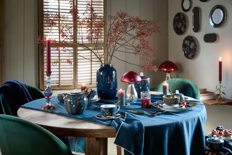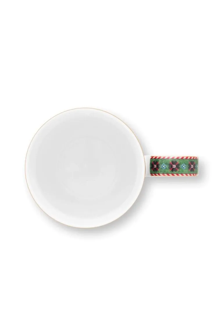 Diese extra große Tasse ist Teil unserer Berry Blues Kollektion. Die Tasse ist mit einem tiefgrünen Fliesenmuster mit roten Akzenten verziert, das an die bekannten Winterkaros erinnert. Die Ränder sind mit goldenen Akzenten und einem überraschenden rot-weißen Streifen versehen, was der Tasse XL Clover eine extra warme und gemütliche Ausstrahlung verleiht.